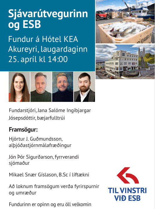 Samtökin Til vinstri við ESB standa fyrir áhugaverðum fundi á Akureyri á laugardag um Evrópusambandið og sjávarútveg. Enda þótt þessi samtök sem kenna sig við vinstri pólitík standi að fundinum koma frummælendur víðar að en frá vinstri enda varðar framtíð sjávarútvegs á Íslandi ladsmenn alla og mikilvægt að fólk hvar í flokki sem það stendur skilji hvað það þýðir í raun að afhenda Evrópusambandinu forræði yfir sjávarauðlindinni sem myndi gerast með inngöngu Íslands í sambandið hvað sem semja mætti um í aðlögun að regluverki ESB.
