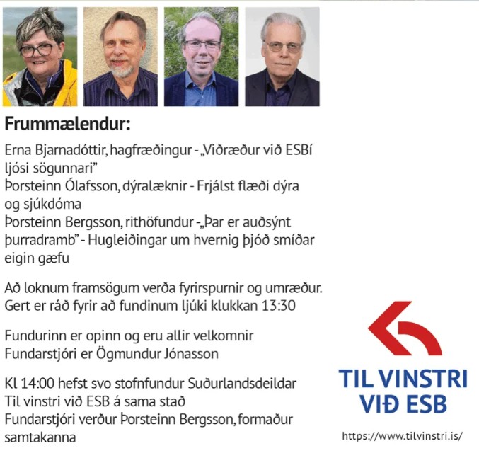 Eins og fram kemur i meðfylgjandi auglýsingu verður svo annar fundur - aðskilinn - um stofnun Suðurlandsdeildar Til Vinstri við ESB. Þar er ég félagi og hvet vinstri menn til þess að fylkja saman liði undir merkjum þessara samtaka.